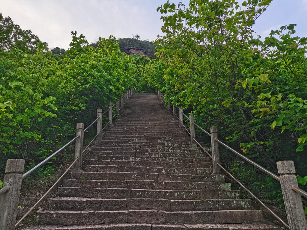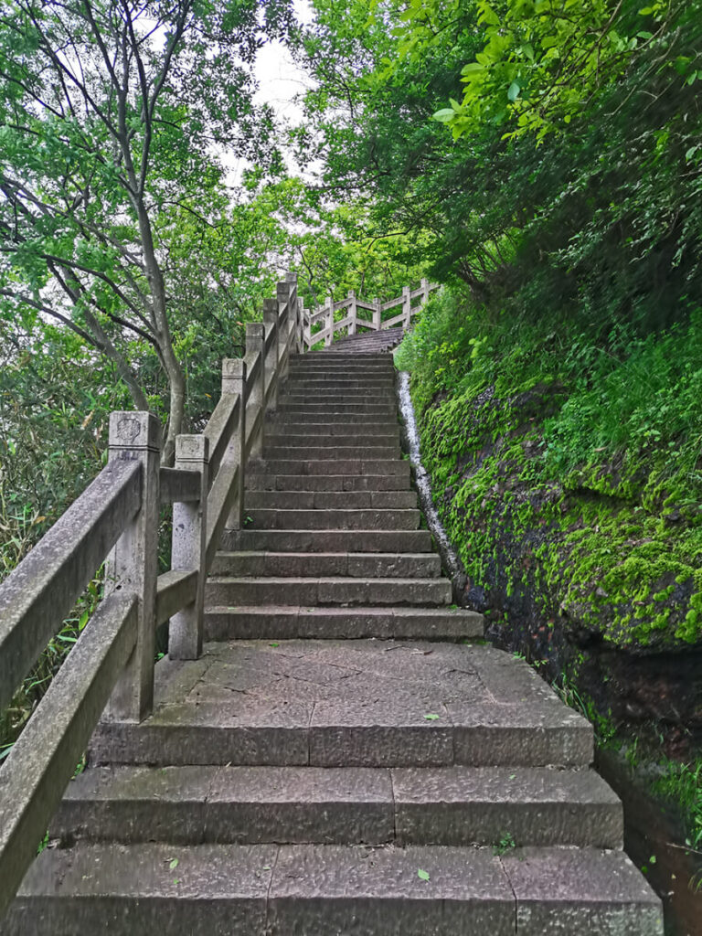 石阶与山体之间还有导流槽,想必是此地多雨多水,山体上长满了绿苔。