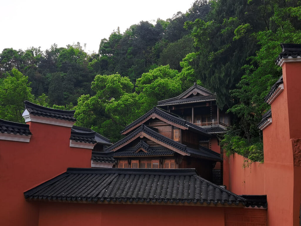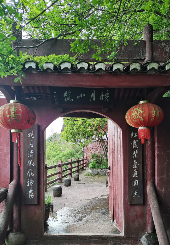 门内为一花木扶疏的小院,北倚山,南临崖,「悟月楼」横匾悬于楼上,楼柱有联:“美丑自区分,水镜无尘堪朗照;仙凡相距近,蟾宫有路任遨游。”点出此处的两大美景——「飞檐挂月」和「水镜映月」。