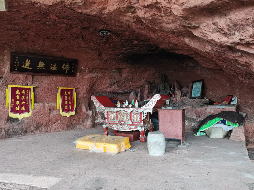 悟月楼对应的洞中摆放着佛像(略一看应为济公),旁挂「佛法无边」四个鎏金大字。佛像前还有被子垫子折叠放在一旁,似乎有人睡在这里。