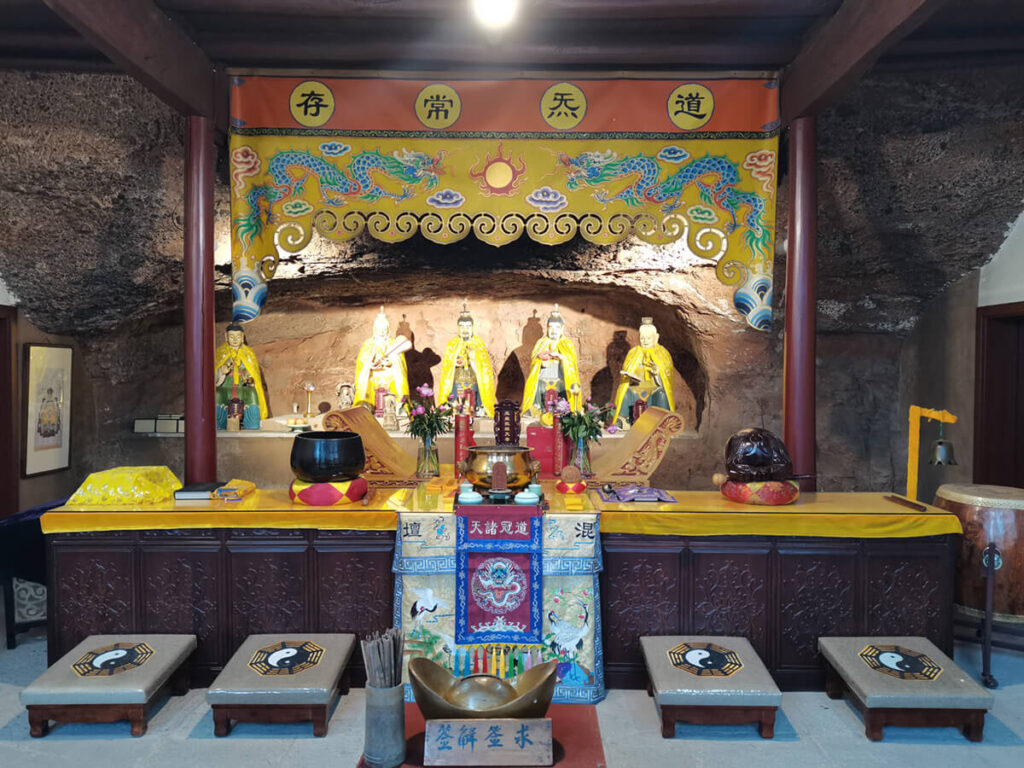 洞内供奉道教三清(太清仙境道德天尊、玉清圣境元始天尊、上清真境灵宝天尊),左侧为云霞玉女紫虚元君,右侧为太极仙翁葛玄祖师。